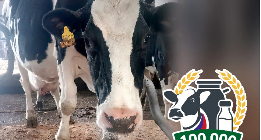 В прошлом году рекордсменкой была другая корова этого хозяйства — по кличке Величина, которая за 11 лактаций произвела 111,9 тыс. кг молока. У нее родилось четыре бычка и семь телочек. Вообще в племенном СПК «Дмитриевы горы» на начало 2025 года дойное стадо насчитывало 1,65 тыс. голов со средними показателями удоев за прошлый год — 12 тыс. кг с 3,88% жира и 3,3% белка.