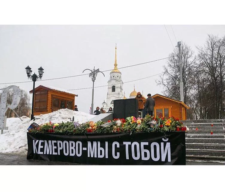 27 марта владимирцы пришли на Соборную площадь областного центра разделить общую боль с кемеровчанами, потерявшими близких в результате страшного пожара. На ступенях перед памятником Андрею Рублёву горожане зажгли свечи и возложили цветы к импровизированному мемориалу.