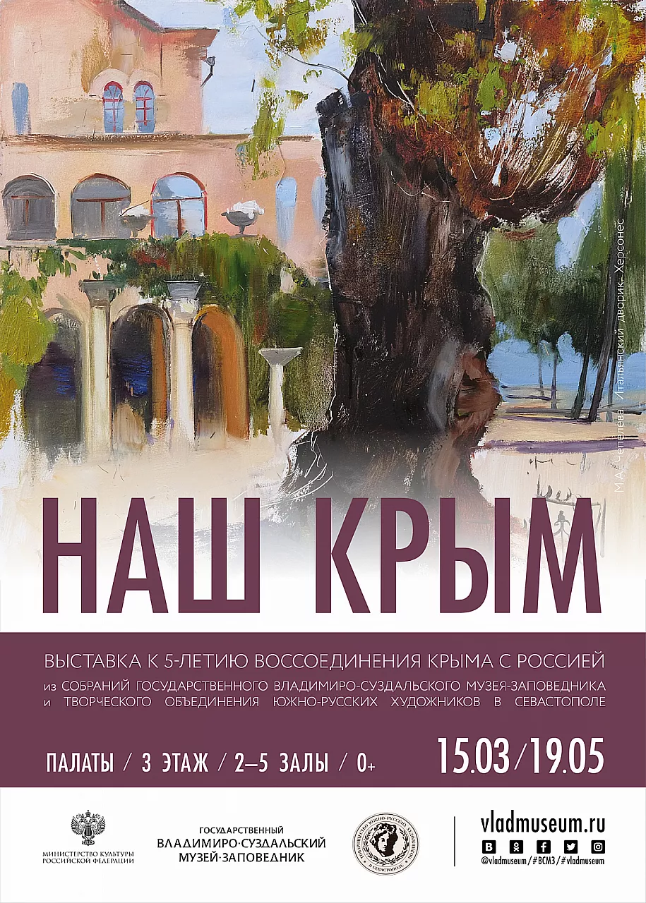 Выставка «Наш Крым» во владимирских "Палатах" открывается к 5-летию возвращения Севастополя и Крыма в состав России. Это первый грандиозный совместный проект Владимиро-Суздальского музея-заповедника и Творческого объединения южнорусских художников города Севастополя. Горожане увидят 89 живописных и графических произведений 35 известных отечественных авторов XIX–XXI вв. Все работы посвящены Крыму –великой и прекрасной земле, которая издревле вдохновляла поэтов и художников, - сообщает ВСМЗ.