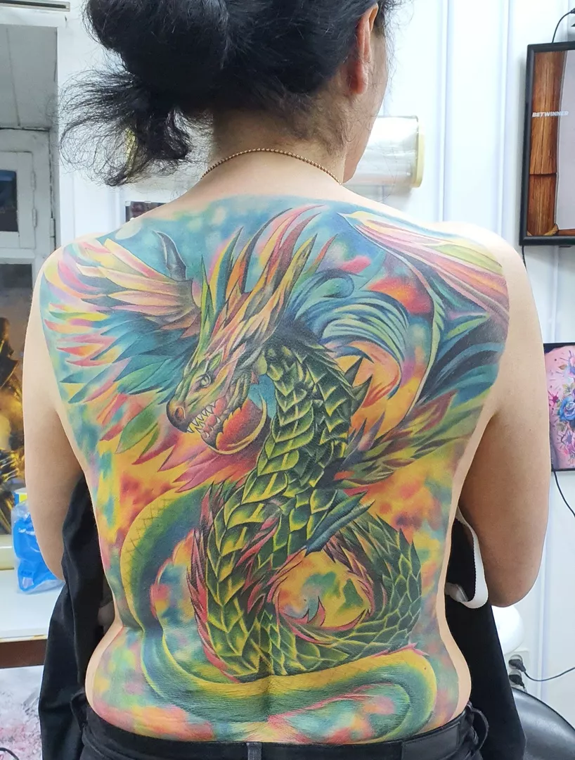 Выбрали дизайн дракоши и приступили. В итоге вот такая яркая рептилия украсила тело от шеи до поясницы.