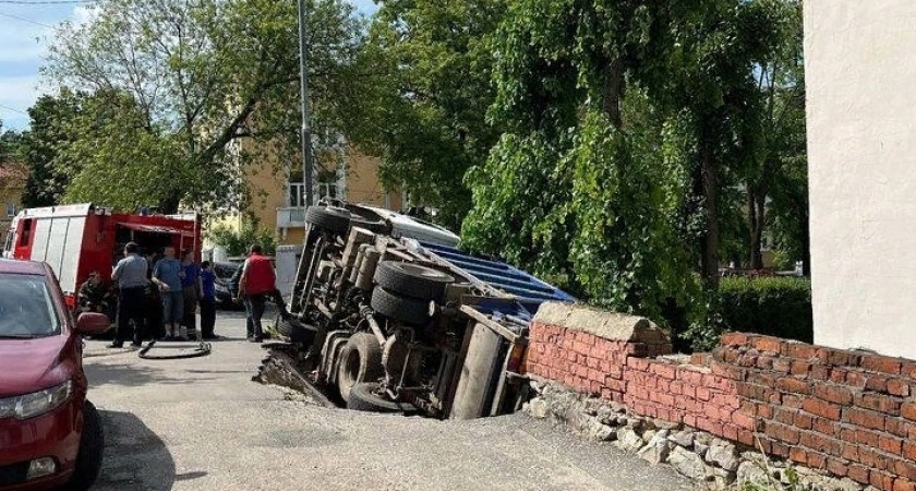 Судя по снимку, на месте работали сотрудники МЧС. В "тревожном" ведомстве сообщили, что грузовик упал из-за обвала грунта. Как такового ДТП нет. Также сообщается, что автомобиль стоял припаркованным, водителя в салоне не было.