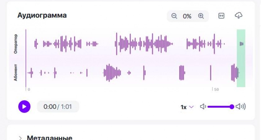 Работать с записями диалогов стало удобнее: пользователь может управлять ключевыми параметрами, включая скорость, масштаб отображения аудиограммы и громкость. Аудиограмма раскладывается на звуковую дорожку оператора и абонента, а в транскрипте диалога отображаются переходы между репликами и выбранные для анализа метрики, слова, триггерные фразы. Клиент также может настроить, в каком формате скачать транскрипт диалога для дальнейшей работы — текстовом или табличном.