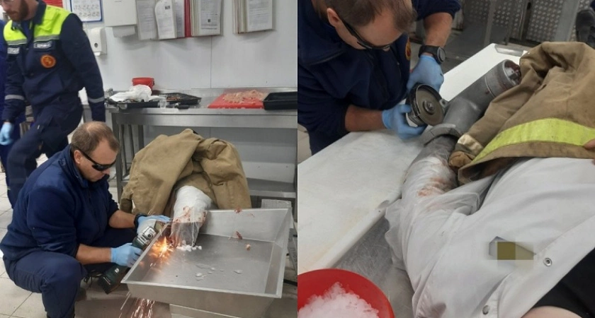 Спасатели около 1 часа болгаркой вырезали руку мужчины из мясорубки. Прибывшие на место медики скорой помощи обезболили и контролировали состояние пострадавшего.