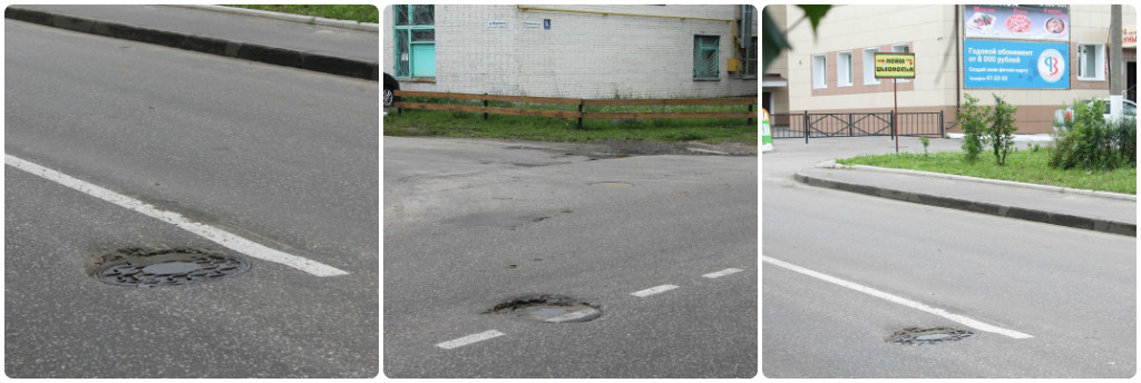 Здесь уже начал разрушаться верхний слой асфальта. И снова активисты пишут о неправильном ремонте полотна возле канализационных люков.