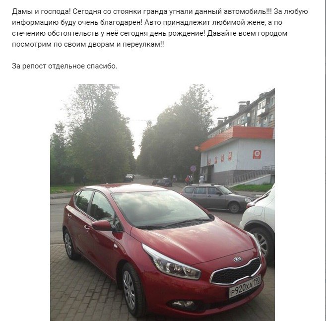 25 сентября в группе “Подслушано Автомобилистов” появился пост от владимирца, у жены которого украли машину. Молодой человек попросил подписчиков быть внимательнее и, если кто-либо заметит KIA Ceed, немедленно сообщить ему. Он добавил, что у его жены сегодня день рождения. Потерпевший также сообщил, что написал заявление в полицию и по камерам слежения ТЦ “Гранд” машину уехала в сторону администрации области.