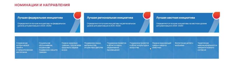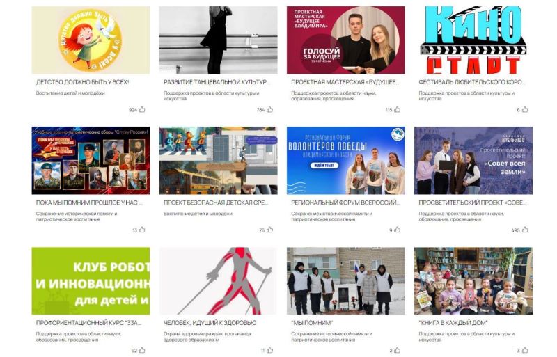 Владимирская область представила 25 инициатив. Они касались самых различных тем: воспитания молодежи, защиты животных и окружающего мира, проектов в области искусства и культуры, поддержки семьи и материнства и многого другого. В зависимости от охвата и направленности все заявки поделены на федеральный, региональный и местный уровни.