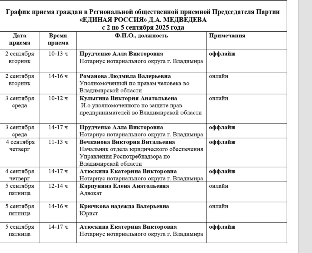 С 2 по 5 сентября 2025 года Региональная общественная приемная Председателя Партии «ЕДИНАЯ РОССИЯ» Д.А.МЕДВЕДЕВА и Местные общественные приемные Партии при участии депутатов всех уровней, сенаторов Российской Федерации, а также представителей профильных ведомств проводят Неделю приемов граждан по вопросам правовой поддержки.