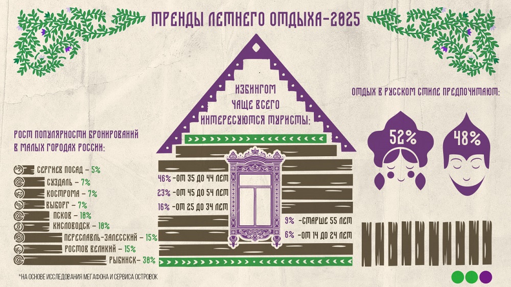 Летом 2025 года владимирцы всё чаще стали отдавать предпочтение спокойному и экологичному отдыху вдали от популярных туристических центров. В качестве мест, где можно замедлиться и побыть в уединении, миллениалы выбирают деревенские избы, глэмпинги и экоотели. Как следует из совместного исследования МегаФона и сервиса онлайн-бронирования отелей и апартаментов Островок, число бронирований из Владимира в малых городах увеличилось примерно на 7-28%. При этом специалисты оператора отмечают рост популярности избинга — размещения в домах в традиционном русском стиле.
