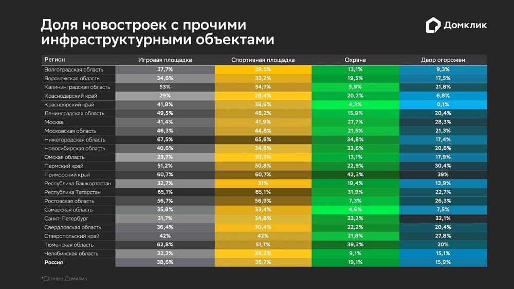 Самыми распространёнными объектами на территории новых жилых комплексов в России стали детские игровые площадки (38,6%). Здесь лидерами являются ЖК Нижегородской области (67,5%), Республики Татарстан (65,1%) и Тюменской области (62,8%).