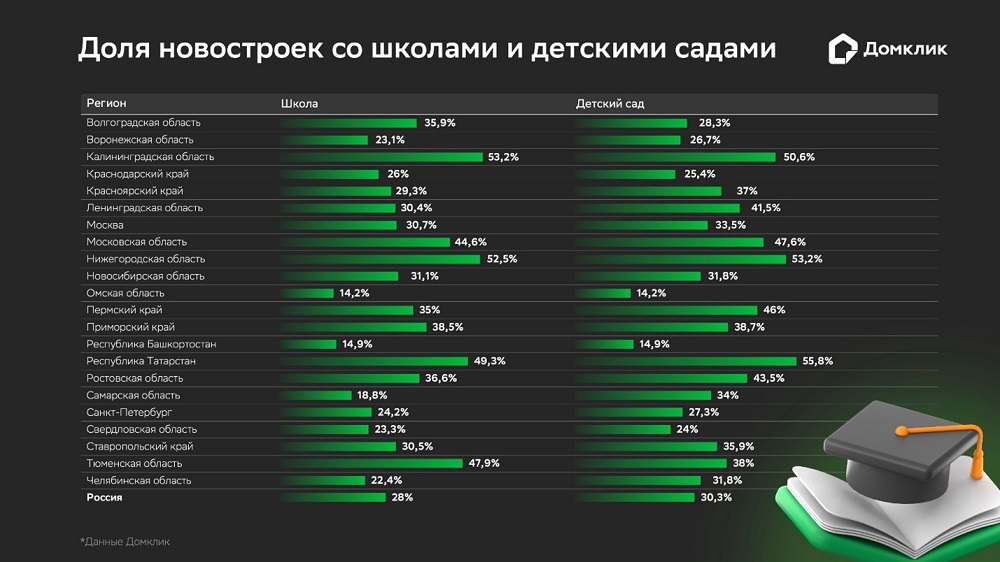 Из рассмотренных регионов лидерами по обеспеченности новых жилых комплексов школами являются Калининградская (53,2%) и Нижегородская области (52,5%), Республика Татарстан (49,3%), Тюменская (47,9%) и Московская (44,6%) области. Меньше всего ЖК со школами в Омской области (14,2%), Республике Башкортостан (14,9%) и Самарской области (18,8%).