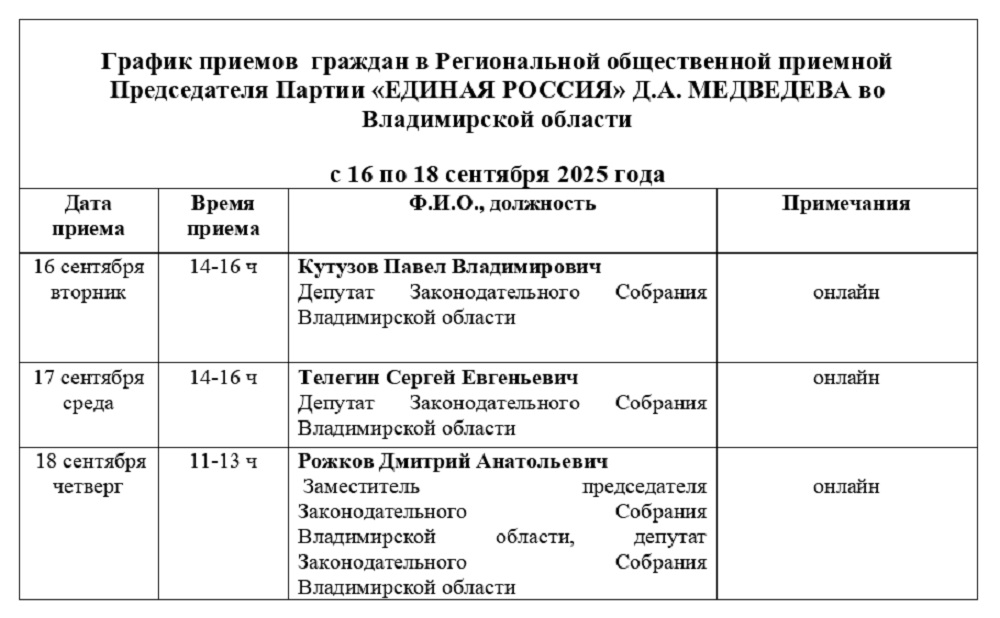 График приемов граждан в Региональной общественной приемной Председателя Партии «ЕДИНАЯ РОССИЯ» Д.А. МЕДВЕДЕВА во Владимирской области