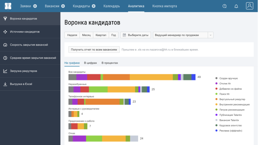 Реальность: Некоторые рекрутеры привыкли работать по классической схеме — сохраняя файлы на компьютере, получая заявки от линейных руководителей и отправляя информацию о соискателях по электронной почте. Рекрутер постоянно в напряжении — нельзя ничего забыть! Автоматизация позволяет взглянуть на процессы подбора персонала по-новому и оптимизировать их, освободить рекрутера от рутинных операций, увеличить скорость найма, сделать процесс подбора персонала прозрачным, а закрытие вакансий — более оперативным. Например, облачная система для подбора персонала Talantix позволяет автоматизировать самые высокочастотные действия рекрутеров — занесение кандидатов в систему с job-сайтов и из соцсетей, переписку с соискателями на разных этапах отбора (приглашение на собеседование, отправку оффера или отказа), отправку и получение тестового задания. Автоматические фильтры отбора кандидатов, готовые отчеты, единое пространство для всех участников подбора — все это и многое другое входит в функционал программы.