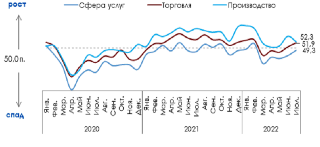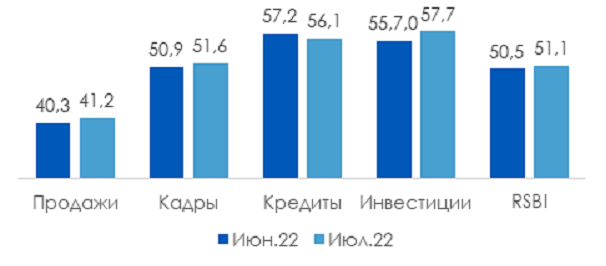 Согласно Индексу RSBI, который в июле 2022 года увеличился до 51,1 пункта, деловая активность продолжила плавный рост, в том числе за счет ощутимых изменений в компоненте инвестиций, которая увеличилась на 2 п.п. по сравнению с предыдущим месяцем и сравнялась с показателями конца прошлого года.