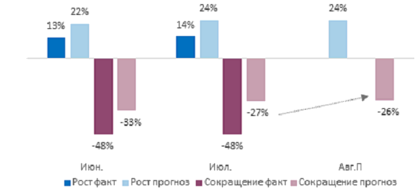 Ожидания на ближайшие три месяца также сохранили динамику. Роста выручки в будущем ждет 24% опрошенных, как и месяцем ранее, а 26% респондентов заявили, что готовятся к снижению выручки, что также сопоставимо с показателями июня.