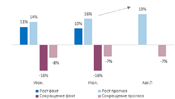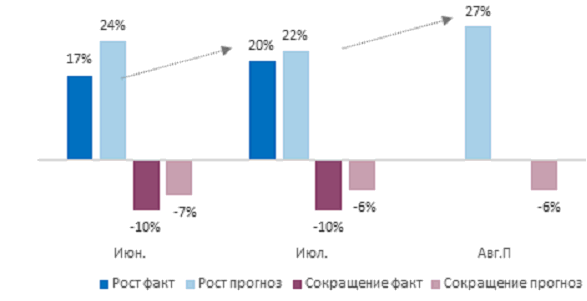 Доля тех, кто нанимал новый персонал, составила 10%, что сопоставимо с данными прошлого месяца, а тех, кто сокращал штат в июле, осталась неизменной на уровне 16%.