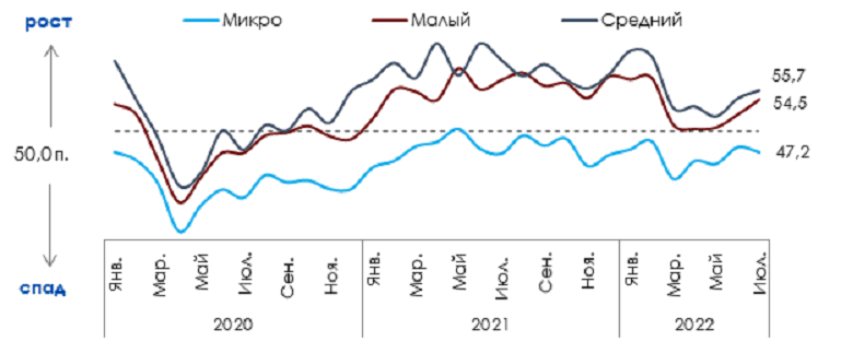 В июле малый и средний бизнес наращивали активность, в то время как активность микробизнеса снова начала снижаться. В целом малый бизнес сейчас делится на тех, кто могут наращивать темпы роста, и тех, кто пострадал из-за санкций или изменения потребительского настроения.