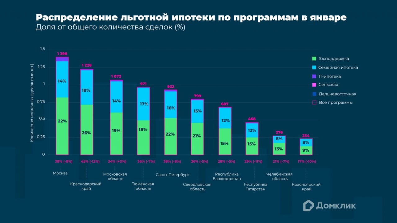 Количество выданных кредитов по льготным программам за январь 2023 года для топ-10 регионов по числу выдач ипотеки. Доля выдач по программе «Господдержка» относительно общего количества выдач за месяц показана зелёным, «Семейная ипотека» — голубым, «Ипотека для IT» — фиолетовым, «Дальневосточная ипотека» — синим, «Сельская ипотека» — розовым. Данные отсортированы по суммарному количеству сделок по всем указанным льготным программам.