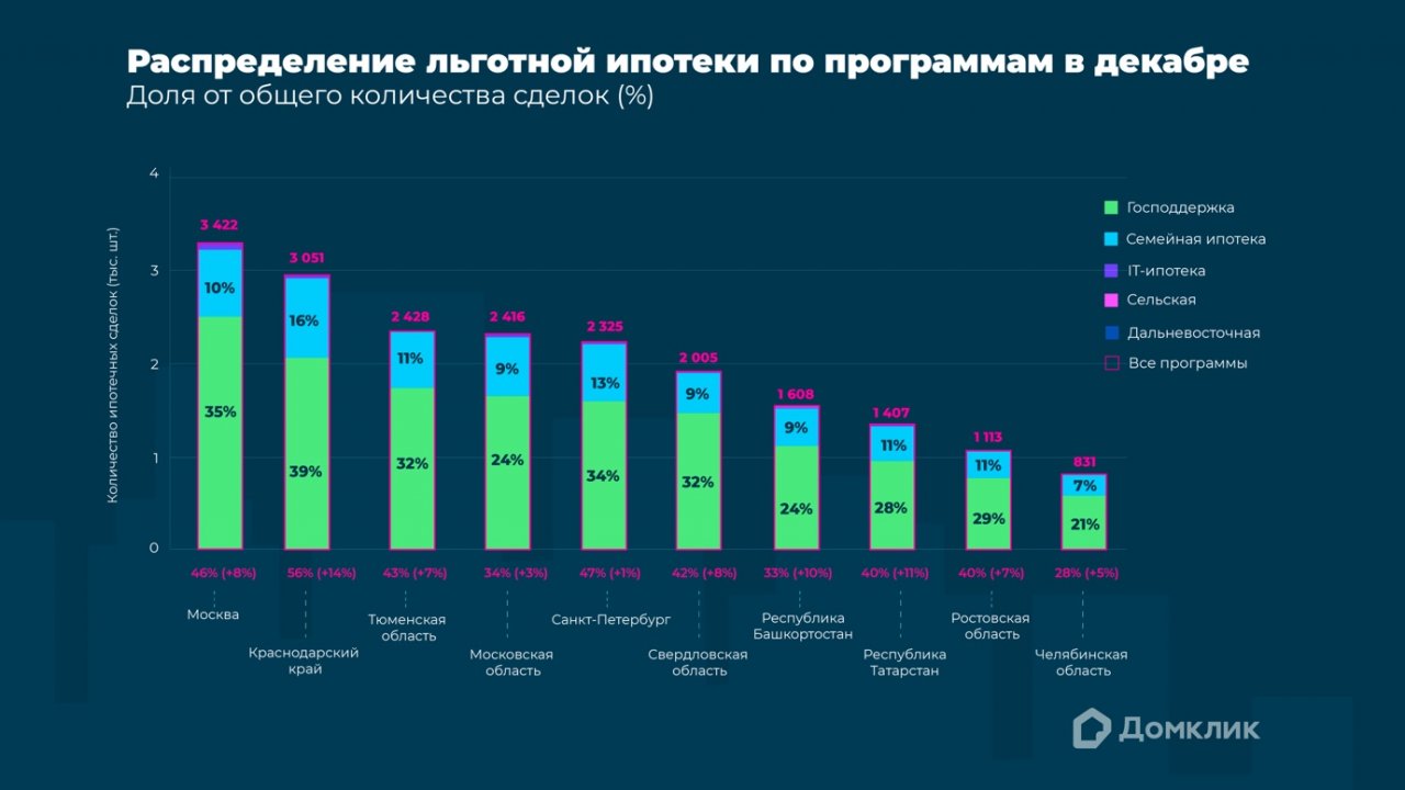 Количество выданных кредитов по льготным программам за декабрь 2022 года для топ-10 регионов по числу выдач ипотеки. Доля выдач по программе «Господдержка» относительно общего количества выдач за месяц показана зелёным, «Семейная ипотека» — голубым, «Ипотека для IT» — фиолетовым, «Дальневосточная ипотека» — синим, «Сельская ипотека» — розовым. Данные отсортированы по суммарному количеству сделок по всем указанным льготным программам.