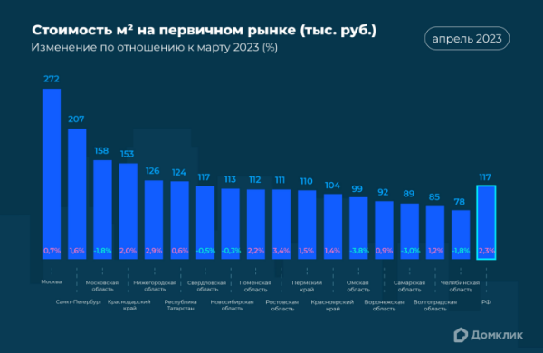 Устойчивый спрос на ипотеку в целом и первичное жильё в частности стабилизировал цены. По мнению экспертов Домклик, пока процесс поиска нового равновесного уровня продолжается: как показывают данные о заключённых ипотечных сделках Сбера, в апреле средняя стоимость квадратного метра по стране увеличилась — на 2,3% (по отношению к марту) — и составила 116 тыс. рублей.