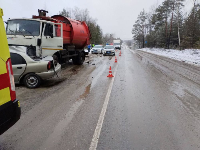 По предварительным данным, водитель автомобиля «Шевроле Ланос» не справился с управлением, машину занесло, и она выехала на встречную полосу, где столкнулась с грузовиком «МАЗ».