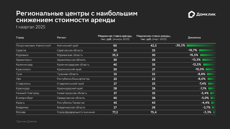 Аналитики "Домклик" изучили стоимость аренды на основе объявлений в региональных центрах России на начало и конец I квартала 2025 года и определили города с наиболее значимым снижением цен. Лидерами стали Петропавловск-Камчатский (-29,2%), Саратов (-16,7%) и Мурманск (-15,5%). Москва расположилась на последней строчке рейтинга (-2,3%).