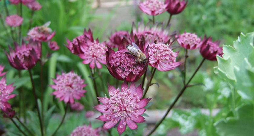 Пальчатые листья и звездчатые соцветия на 70-сантиметровых стеблях создают объем. Цветение длится с мая до заморозков, окраска варьирует от белоснежной до темно-рубиновой.