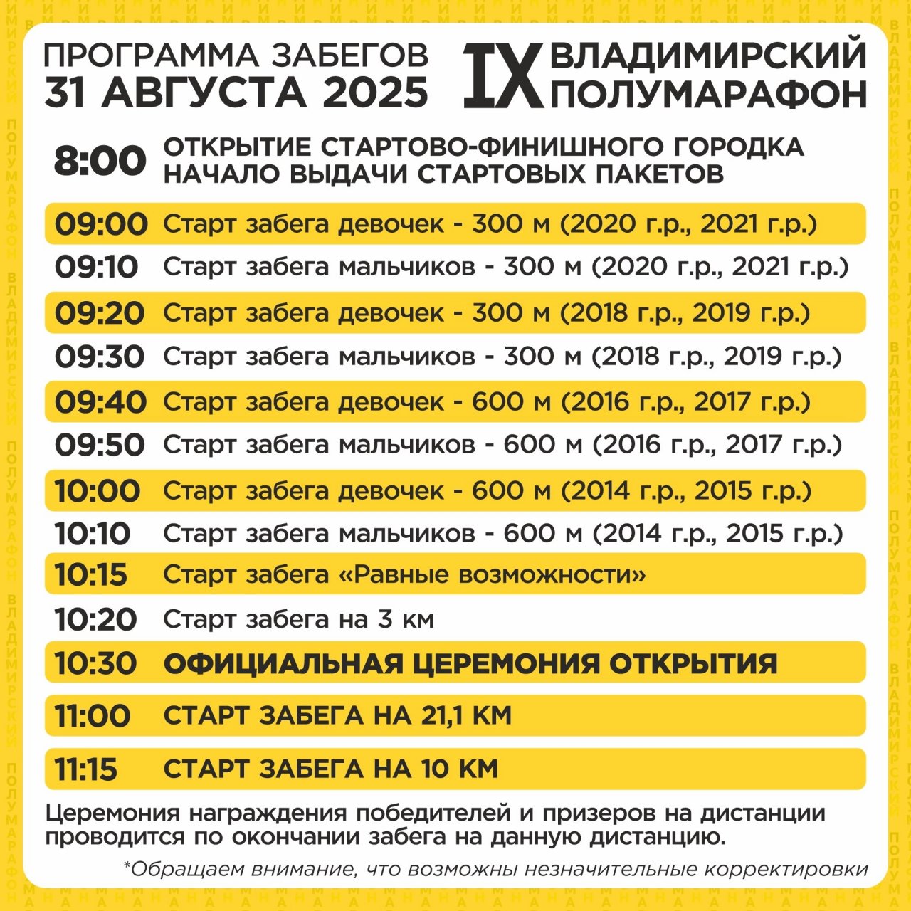Программа включает забеги для детей разных возрастов, дистанции на 3, 10 и 21,1 км, а также забег «Равные возможности». Торжественное открытие состоится в 10:30. Для всех участников и гостей организуют бесплатные экскурсии к Золотым воротам 30 августа в 17:30 и 31 августа в 14:30.