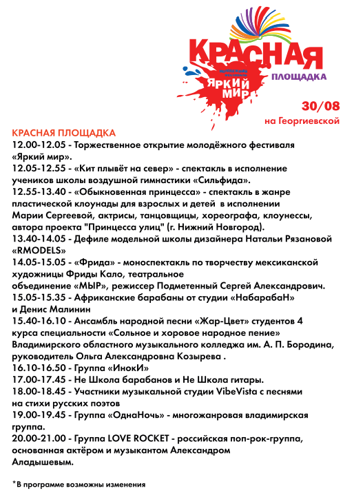 На красной площадке пройдут спектакли — воздушные гимнасты покажут историю «Кит плывёт на север», а артистка из Нижнего Новгорода представит пластическую клоунаду. Зрителей также ждут дефиле, моноспектакль о художнице Фриде Кало, выступления ансамбля народной песни и концерты групп «ИнокИ», «ОднаНочь» и LOVE ROCKET.