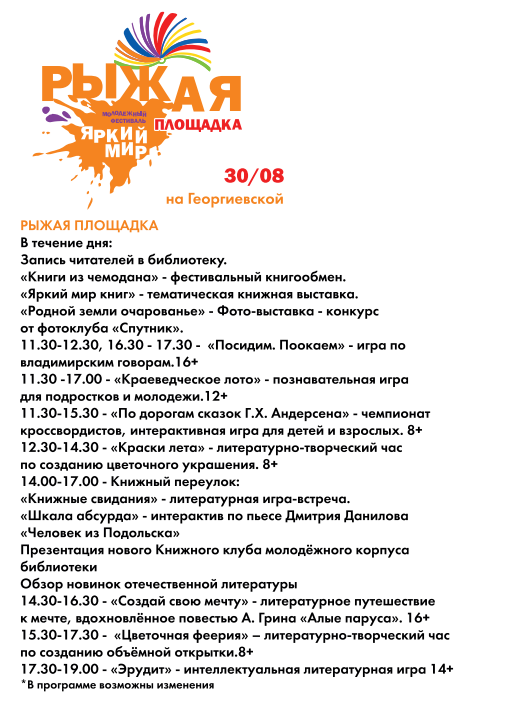 На рыжей площадке развернётся книжный мир: можно будет записаться в библиотеку, поучаствовать в книгообмене, посетить выставки и краеведческие игры.