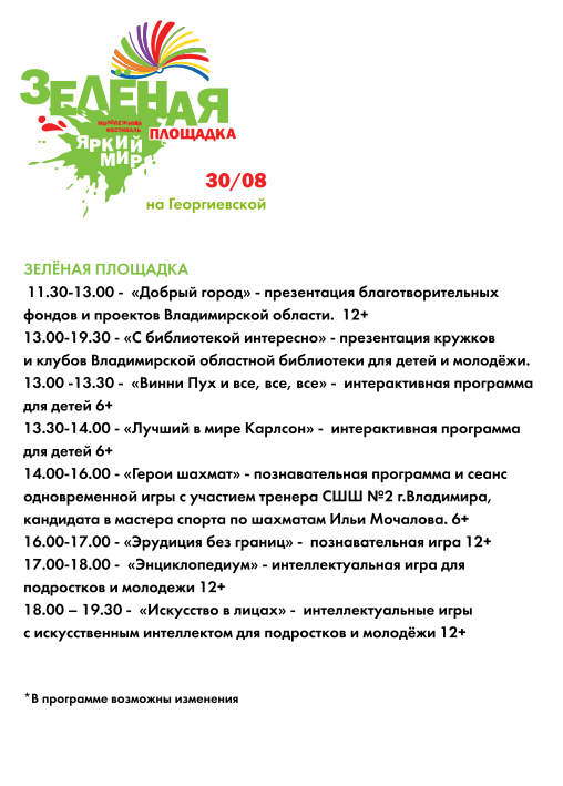 Зелёная площадка предложит познакомиться с благотворительными проектами, послушать о кружках, поиграть в шахматы с опытным тренером и поучаствовать в викторинах.