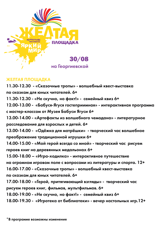 Жёлтая и синяя площадки будут работать для семей с детьми — тут пройдут квесты по сказкам, творческие мастер-классы, игротеки, выступления дзюдоистов и уличных культур.