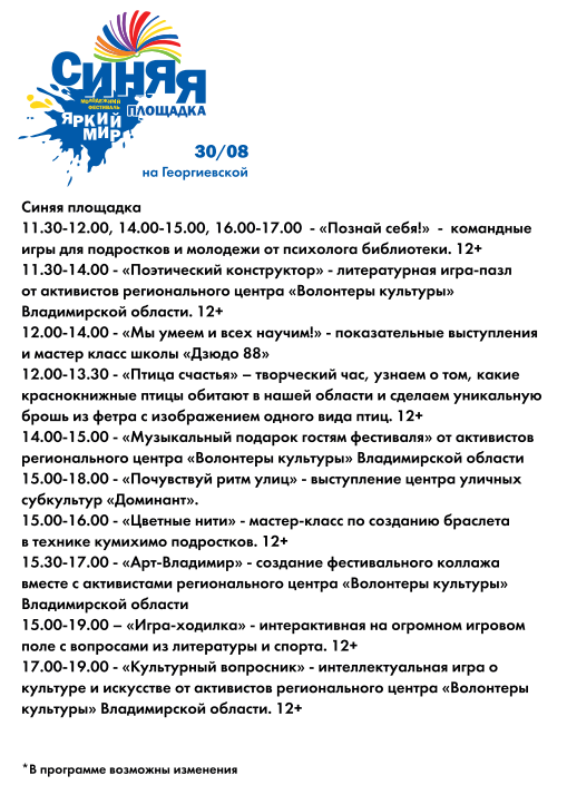 В рамках празднования Дня города Владимира на улице Георгиевской развернётся масштабный фестиваль «Яркий мир». Пространство будет организовано в формате четырёх тематических площадок, каждая из которых выделена своим цветом и посвящена определённому направлению.