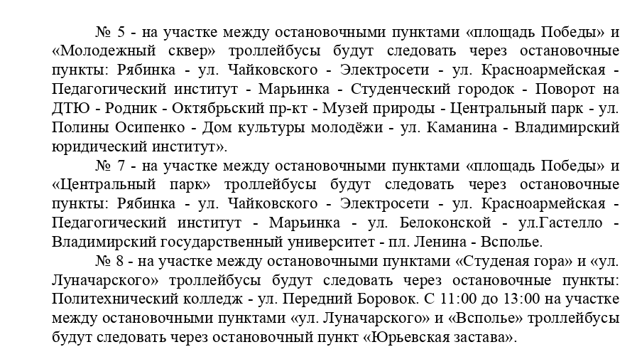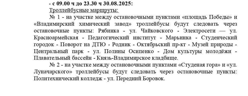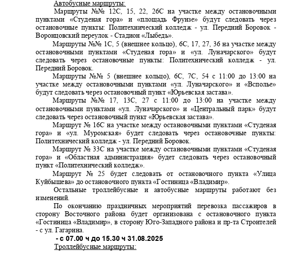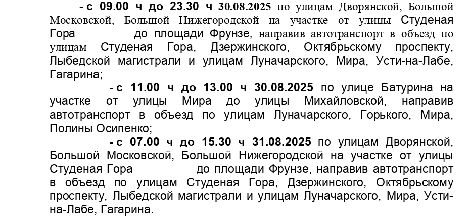 По информации, опубликованной пресс-службой администрации Владимира, ограничения будут действовать в определённые часы на центральных улицах. В субботу, 30 августа, с 9 утра до 11:30 вечера перекроют движение по нескольким центральным магистралям в районе исторического центра. Для автомобилистов организуют объезд по альтернативным маршрутам.