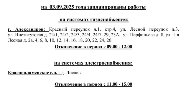В Александровском районе запланированы плановые отключения газа и электричества. Об этом информирует официальное сообщество Управление по делам ГО и ЧС района во «ВКонтакте».