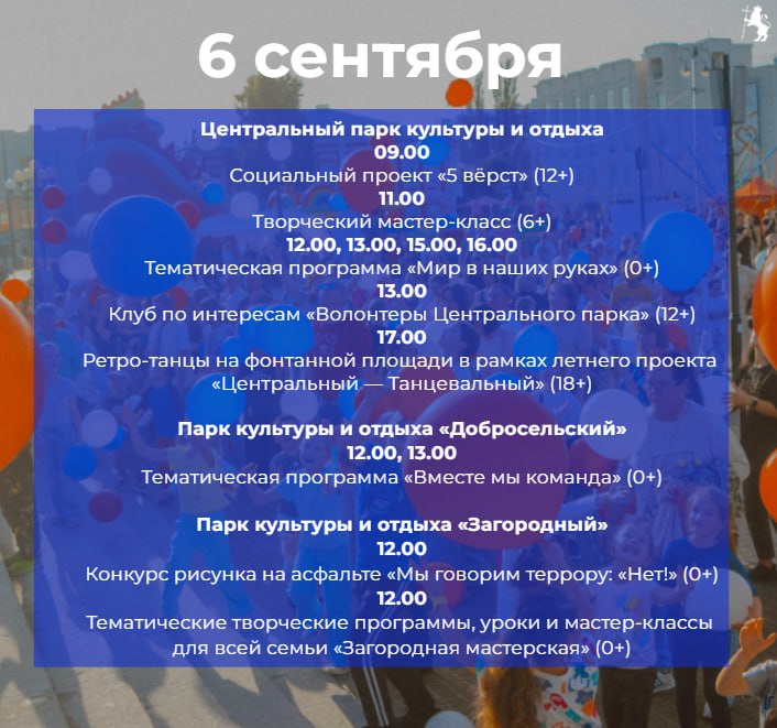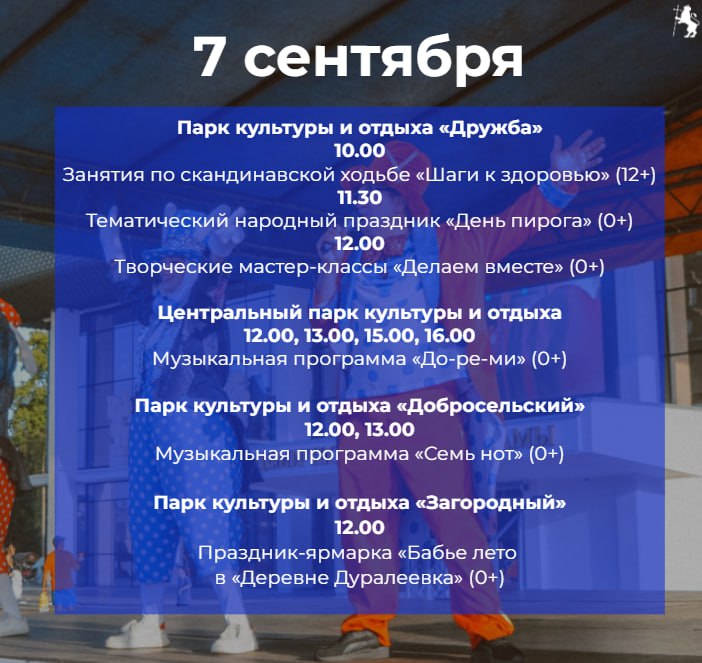 В воскресенье, седьмого сентября, активных горожан ждут в парке «Дружба» на занятиях по скандинавской ходьбе, народном празднике «День пирога» и мастер-классах. Центральный парк и «Добросельский» подготовили музыкальные программы — «До-ре-ми» и «Семь нот». А в «Загородном» развернётся праздничная ярмарка «Бабье лето в Деревне Дуралеевка».