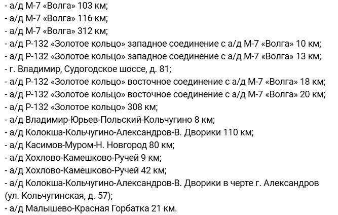 Полный список промежутков автодорог 33 региона, где будут установлены передвижные камеры контроля: