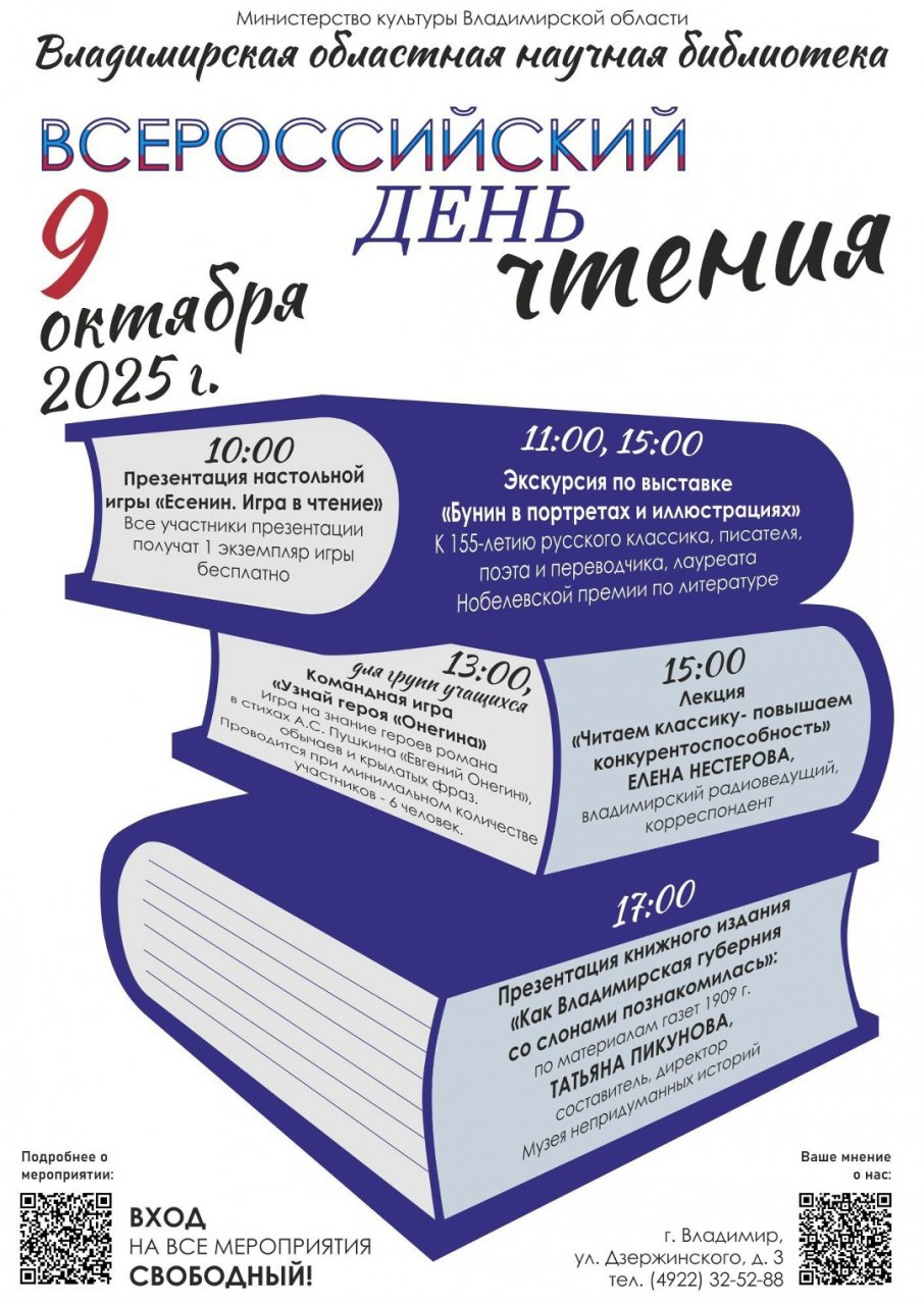 Завтра во Владимире пройдёт масштабный праздник для книголюбов — Всероссийский день чтения в областной научной библиотеке. Как сообщает пресс-служба министерства культуры 33 региона, гостей ждёт насыщенная программа, рассчитанная на целый день, при этом посещение всех событий полностью бесплатное.
