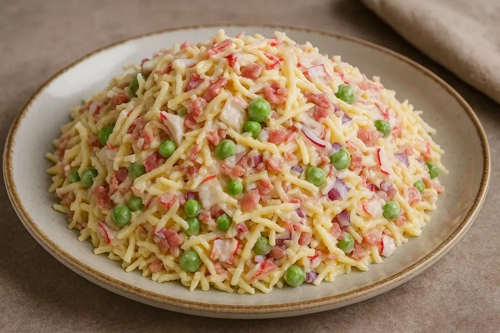 Салат «Сеновал» — это холодное блюдо, в котором сочетаются разные текстуры: мягкие крабовые палочки, хрустящий картофель и сочный редис: