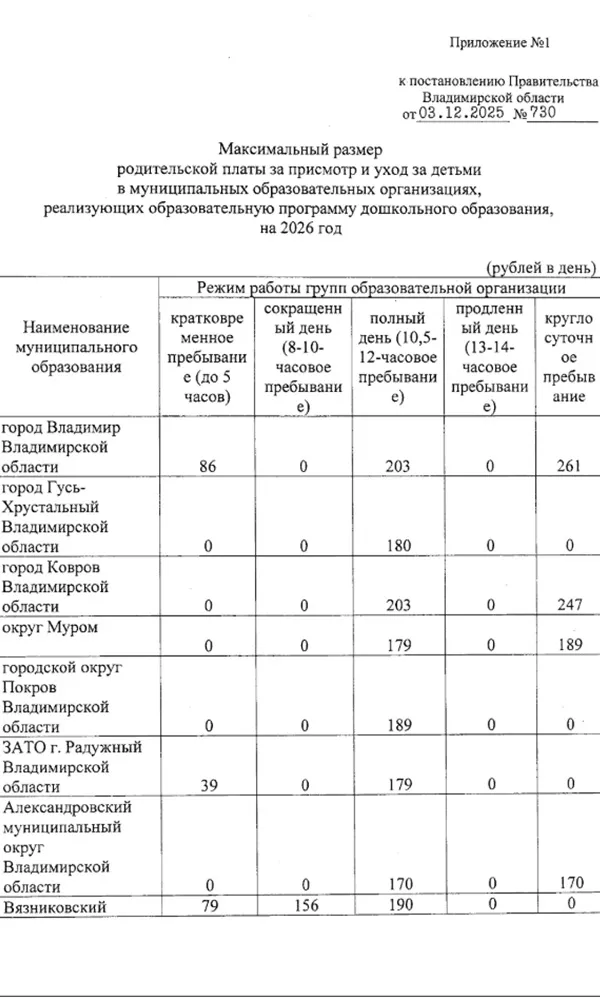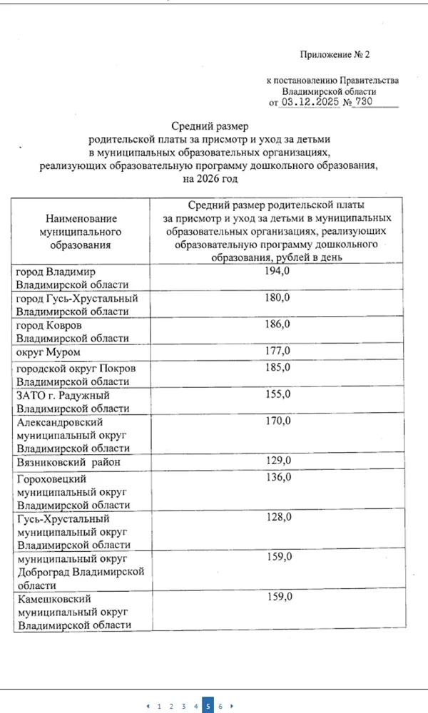 С наступлением нового года в детских садах Владимирской области повысится размер оплаты. Такое постановление главы региона Александра Авдеева с таблицей обновленных расценок опубликовали на официальном портале правовой информации. Изменения коснулись средней и максимальной платы, но итоговые тарифы будут устанавливать муниципалитеты в рамках обозначенного областным правительством коридора.