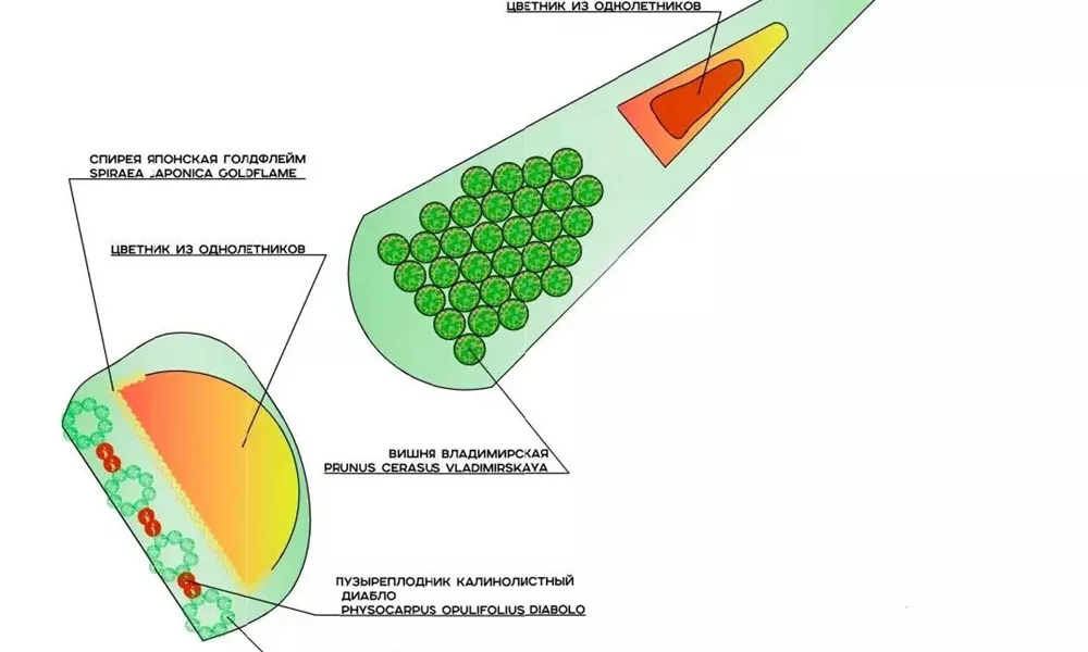 Деревья будут обрамлены туями, там же высадят кусты пузыреплодника и разместят два цветника из однолетних растений, чтобы добавить ярких красок.