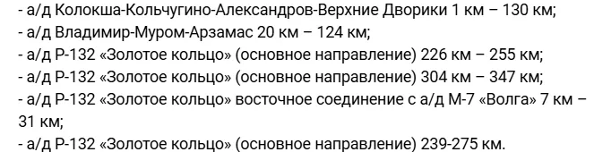 Дополнительный контроль также запланирован на протяжённых участках магистралей «Колокша-Кольчугино-Александров-Верхние Дворики» и «Владимир-Муром-Арзамас», а также на различных отрезках трассы Р-132 «Золотое кольцо»: