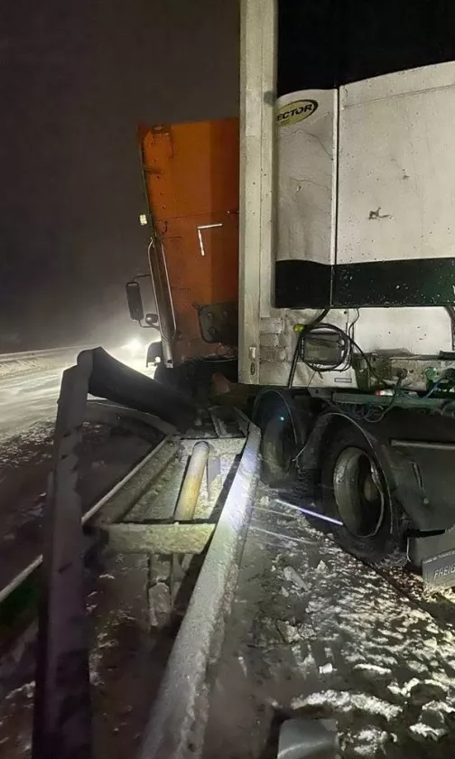 Спасатели вернулись к первому происшествию. Чтобы эвакуатор мог вытащить фуру, им пришлось срезать часть металлического отбойника с помощью специального оборудования. Работы завершились к 23:00, после чего расчет вернулся в отряд.