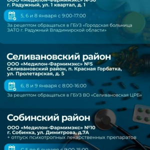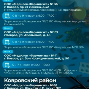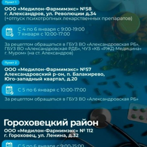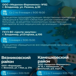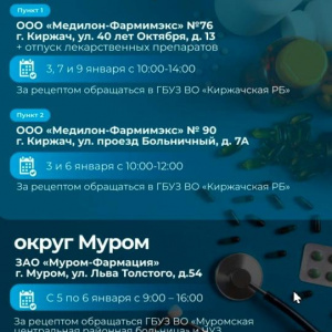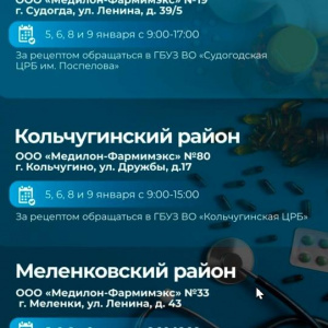 Пресс-служба Правительства Владимирской области обнародовала график работы аптечных пунктов и государственных медицинских учреждений, которые призваны обеспечивать лекарственными препаратами жителей-льготников в январские праздничные дни 2026 года. Информация представлена на карточках с разбивкой по районам (см. ниже, в разделе "Галерея")