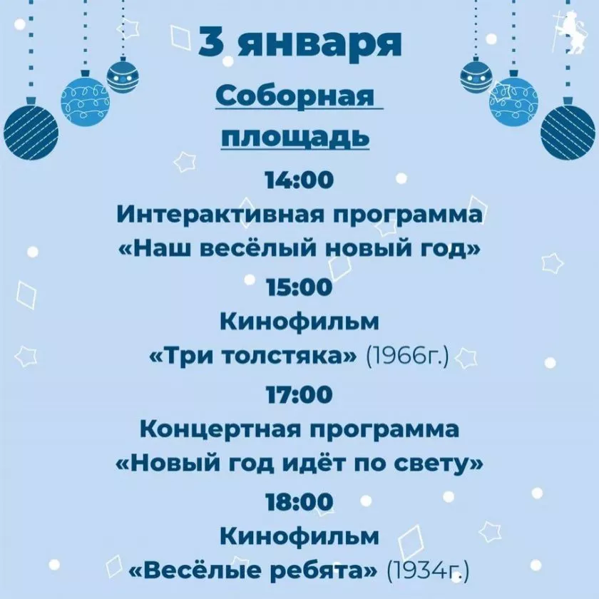 Главной площадкой праздника станет Соборная площадь, где программа начнётся в 14:00 интерактивным шоу «Наш весёлый Новый год». В 15:00 на большом экране покажут классический фильм «Три толстяка» 1966 года, а в 17:00 начнётся концерт «Новый год идёт по свету». Вечер завершится кинопоказом легендарной комедии «Весёлые ребята» (1934 г.) в 18:00.