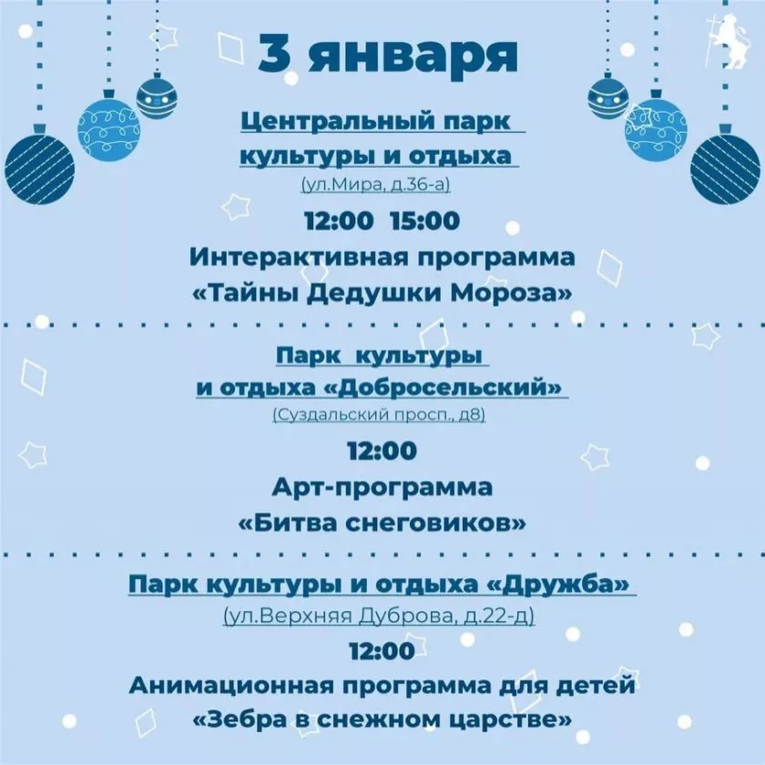 Третий день нового года, 3 января, во Владимире будет насыщен событиями для всей семьи. Афишей праздничных гуляний поделилась пресс-служба мэрии.