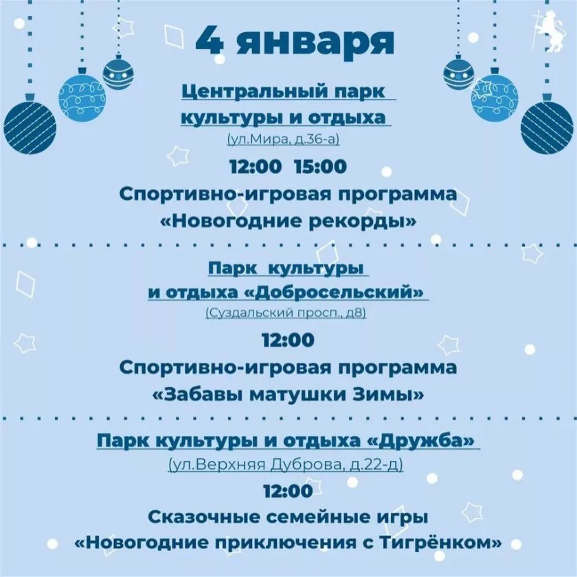 Согласно афиши, опубликованной пресс-службой мэрии, в Центральном парке на улице Мира с двенадцати до трёх часов дня пройдёт спортивно-игровая программа «Новогодние рекорды». Парк «Добросельский» на Суздальском проспекте в это же время ждёт гостей на «Забавы матушки Зимы». А в парке «Дружба» на Верхней Дуброве можно будет поучаствовать в сказочных семейных играх «Новогодние приключения с Тигрёнком».