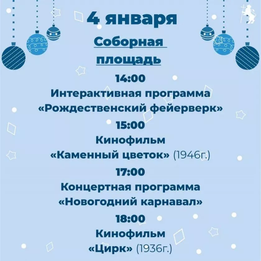 На Соборной площади события начнутся после обеда. В два часа дня там стартует интерактивная программа «Рождественский фейерверк», затем в три часа покажут кинофильм «Каменный цветок», а в пять вечера начнётся концертная программа «Новогодний карнавал».