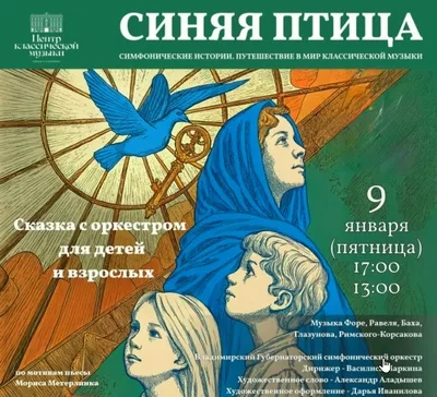 Сегодня же, в 13:00 и 17:00, во Владимирском центре классическом музыки (Большая Московская ул., 28) можно насладиться сеансами «сказки с оркестром для детей и взрослых» «Синяя птица». Философская сказка бельгийского писателя Мориса Метерлинка о поисках счастья на самом деле учит радоваться тому, что есть, и замечать хорошее вокруг. Исполняет Владимирский Губернаторский симфонический оркестр под управлением Василисы Маркиной. Художественное слово - актер театра драмы Александр Аладышев.