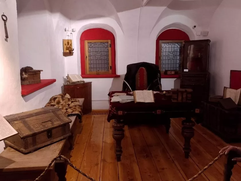 Во-первых, устройство двери между спальнями купца и его супруги: запорная щеколда была только со стороны купца, что демонстрировало неравенство в семейном укладе того времени. Во-вторых, дорожный саквояж хозяина дома и специальный чемодан-подголовник, в котором хранились деньги во время поездок.
