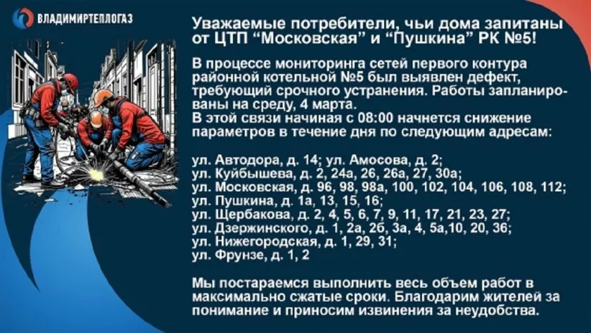 Судьбу ковровчан разделят и некоторые муомляне - в районном центре из-за возникновения дефекта на сетях районной котельной завтра также пройдут ремонтные работы, а жителям придется пережить несколько часов без привычного и комфортного температурного режима.